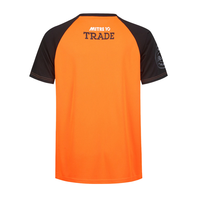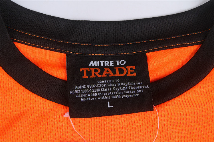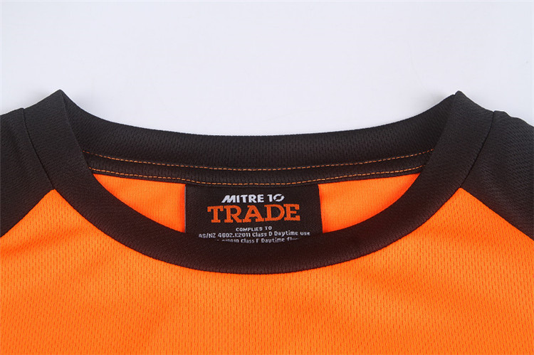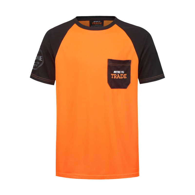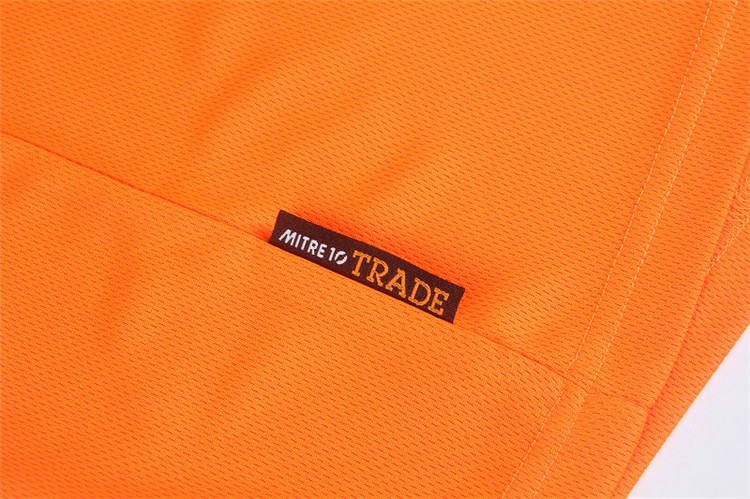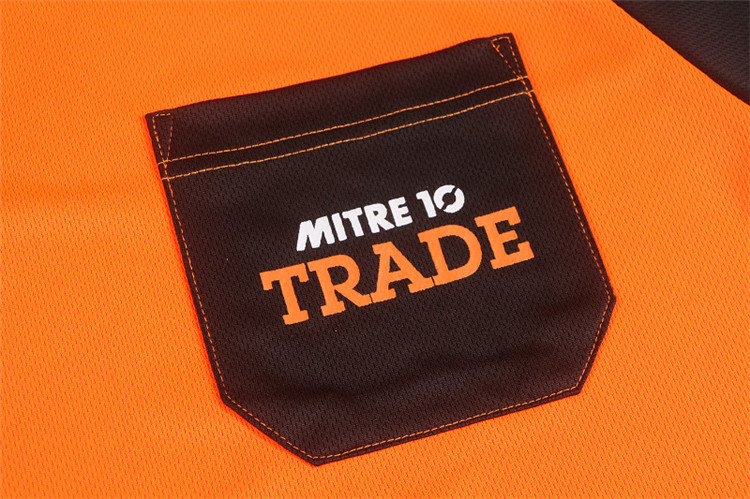 从款式设计来看,这款 T 恤衫采用了极具视觉冲击力的色彩搭配。主体部分以明亮的橙色呈现,活力四射,象征着 Mitre 10 公司积极向上、热情服务的品牌态度,同时也能在工作环境中迅速吸引目光,提升员工辨识度。而黑色的拼接式衣袖,不仅增加了服装的层次感,还在一定程度上起到耐脏、实用的效果。胸前醒目的口袋设计,不仅具有实用性,方便员工放置小物件,更成为了品牌标识的绝佳展示位,“MITRE 10 TRADE” 字样清晰印于口袋之上,强化品牌认知。此外,衣袖及后背处的品牌文字标识,进一步加深了品牌印象,让员工无论从哪个角度,都能成为企业形象的流动宣传窗口。在面料选择上,森洋服饰充分考虑到员工的穿着体验,选用了柔软透气、吸汗速干的高品质面料。这使得员工在忙碌的工作中,始终能保持舒适干爽,有效提升工作效率。此次森洋服饰为 Mitre 10 公司定制的 T 恤衫工作服,不仅是一件实用的工作着装,更是 Mitre 10 公司品牌文化传播的有力载体,完美诠释了企业的独特魅力与精神内涵。