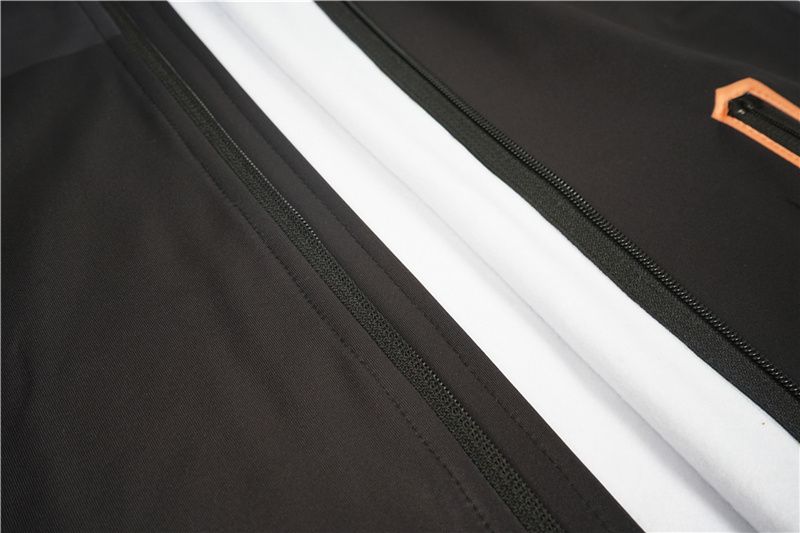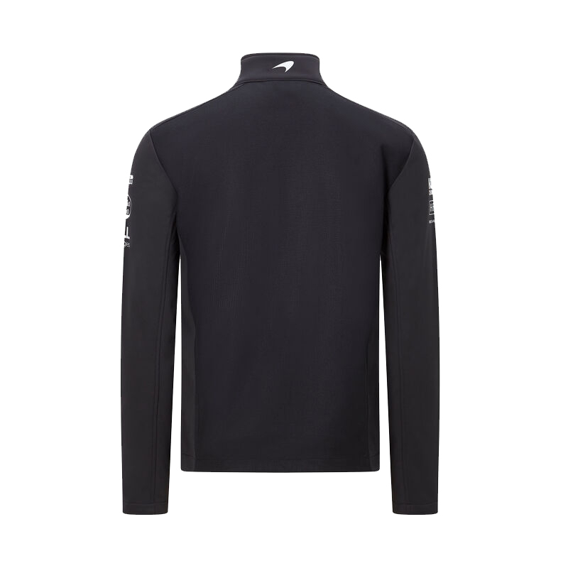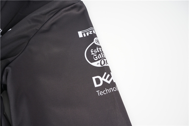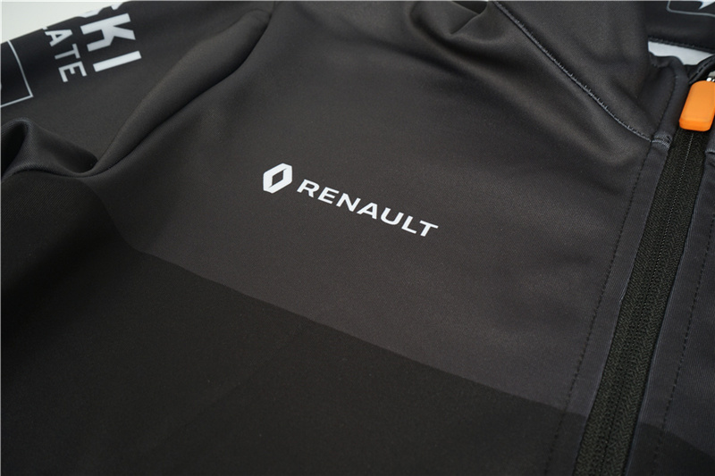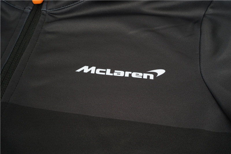 在设计上,整体采用迈凯伦标志性的黑色为主色调,搭配品牌专属的活力橙作为点缀,如拉链头、口袋拉链等细节处的橙色元素,瞬间唤醒赛车迷对迈凯伦的品牌记忆。正面醒目的McLaren品牌标识与合作伙伴雷诺的标志相得益彰,手臂处的系列赞助商标识有序排列,既展现了车队的商业生态,又让服饰的品牌层次感十足。